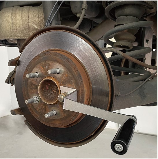 - Simply fix the handle on the brake disc with the original wheel bolt, hold the scraper on the disc edge, and rotate the handle to remove the rust and corrosion.