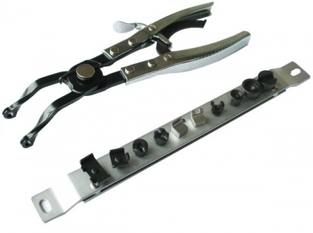 Set of pliers includes 10 interchangeable tips for most types of hose clamps.