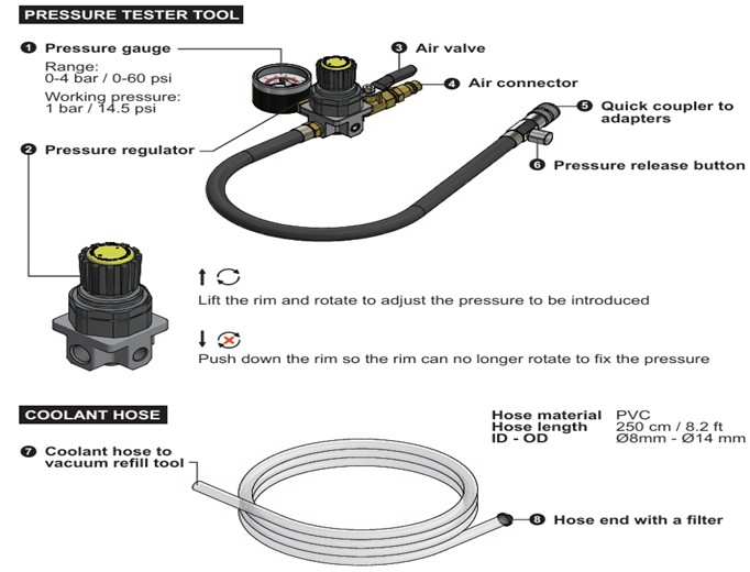 A: Prepare pre-mixed coolant, an air compressor, the correct adapter, and ensure the suction filter remains fully submerged in the coolant during operation.