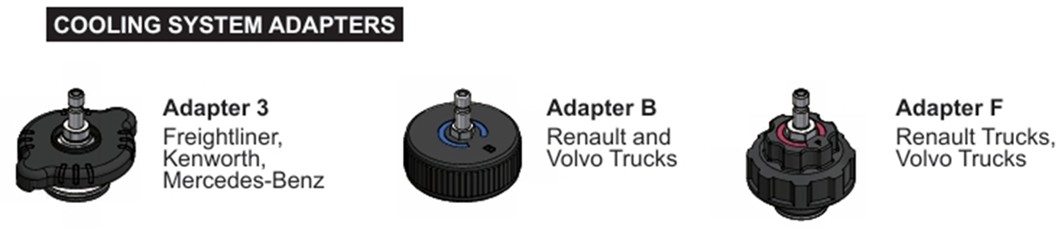 We has been investing in much time and resources on developing this truck cooling system service tool set, specifically on researching the coolant cap adapter applications. There are some truck-oriented cooling system service tool sets on the market, but they are either outdated (been existing since the past 30 years) or market-limited (only for trucks in the US). So We are trying to provide a solution to provide commercial vehicle cooling system cap adapters for the most recent car makes and models and to cover both American and European truck manufacturers and different models. The table below shows an example of the applications from the 9 adapters included in this kit. Of course more applications are possible, and feel free to contact us for more details.