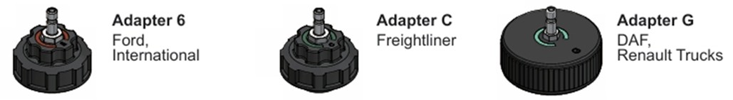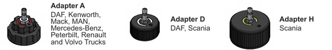 - 9 adapters compatible with heavy-duty vehicles and commercial trucks, including DAF, Ford Trucks, Freightliner, International, Kenworth, Mack, MAN, Mercedes-Benz, Peterbilt, Renault Trucks, Scania, and Volvo Trucks.