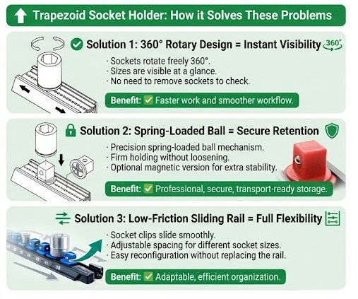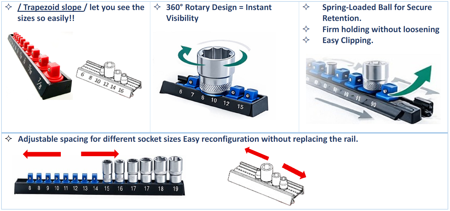 - Each socket clip features a spring-loaded ball retention system that securely holds sockets while allowing full 360-degree rotation. This enables instant access from any angle, reducing hand movement and improving efficiency during daily operations.